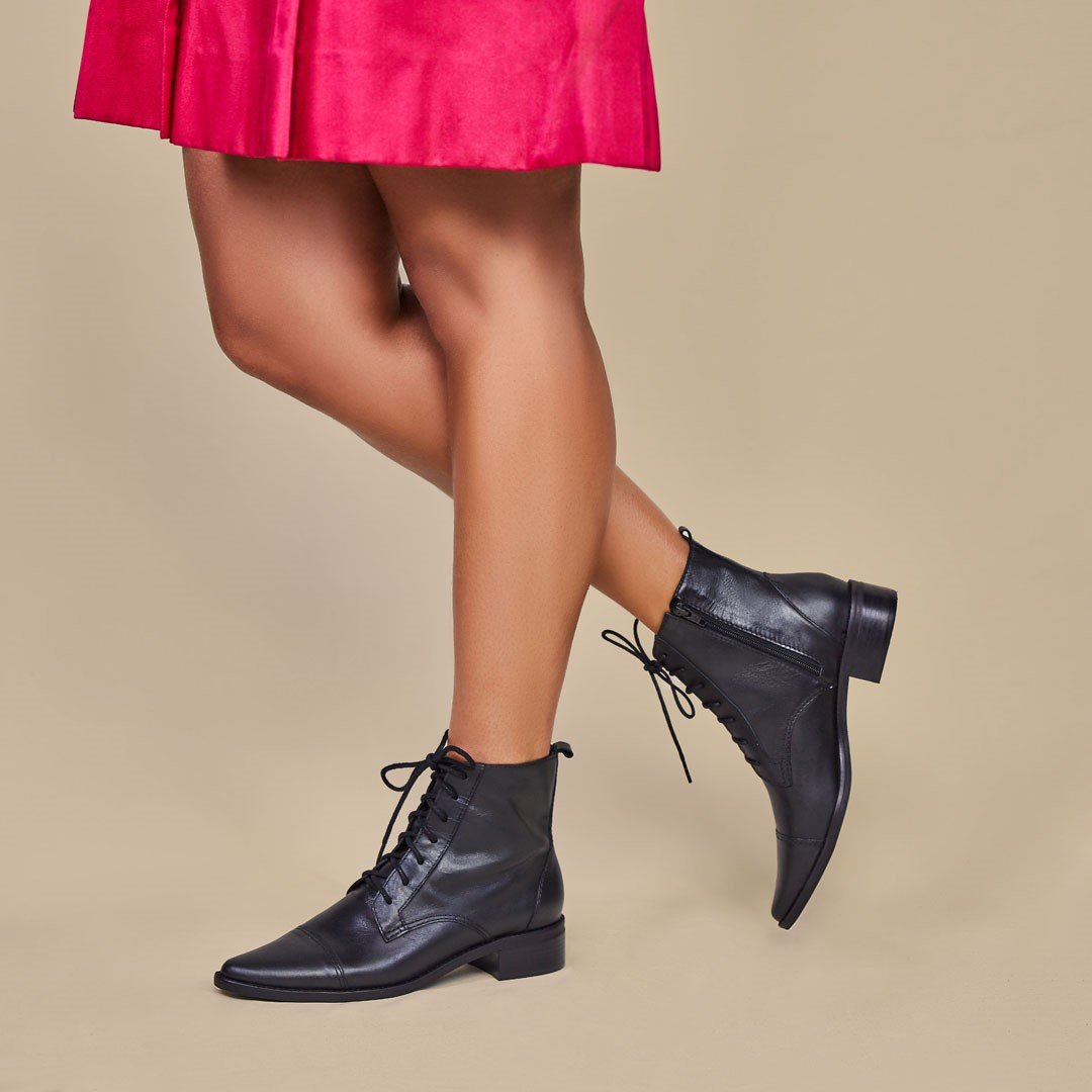 Bota estilo derby em couro legítimo preto com zíper na lateral para facilitar seu dia a dia ! Saltinho 3 cm e solado em borracha TR antiderrapante. Opção perfeita para dias mais frios. Vai bem com calças, vestidos, saias… Toda mulher deve ter uma botinha preta que acompanhe seu estilo.