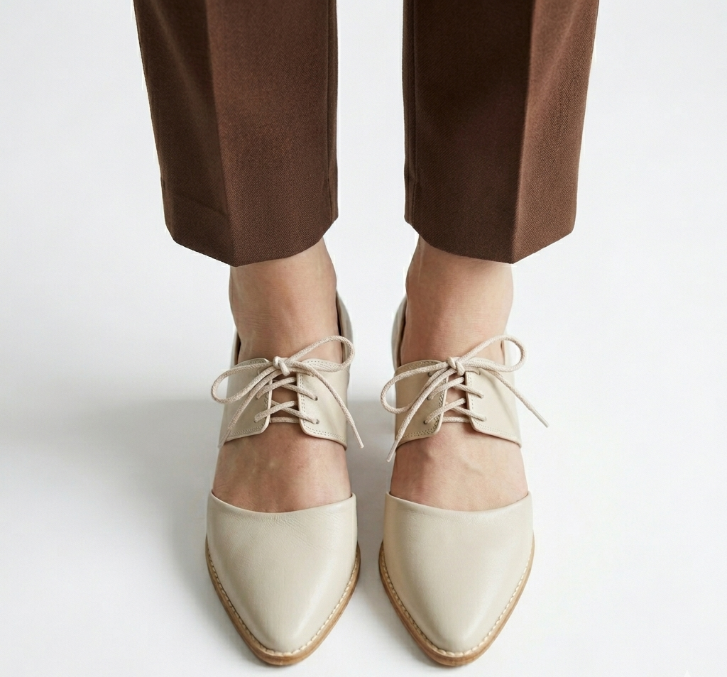 Sapato com tom neutro, alonga suas pernas e combina perfeitamente com qualquer tom de roupa. Couro na cor creme, solado de borracha, saltinho 3 cm. Para um caminhar confortável e elegante, permitindo a ventilação dos seus pés. Palmilha macia