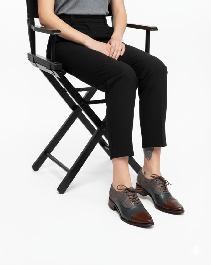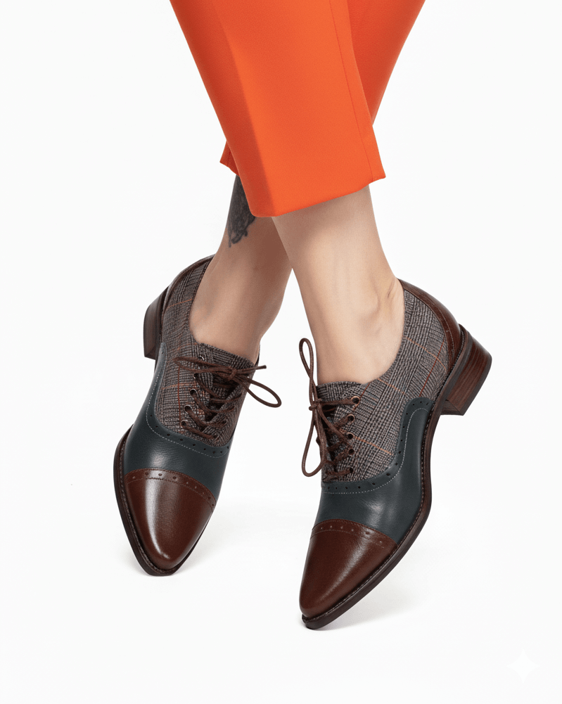 Oxford modelo REF 6740 : tecido na padronagem xadrez clássico Príncipe de Gales, couro nas cores barroco café e grafite . Salto 3 cm. Vai bem com vestido, saia, calça de qualquer cor por ter cores neutras… Solado de borracha antiderrapante, palmilha com látex para um pisar macio, e interior forrado com PU, material que evita suor e odor